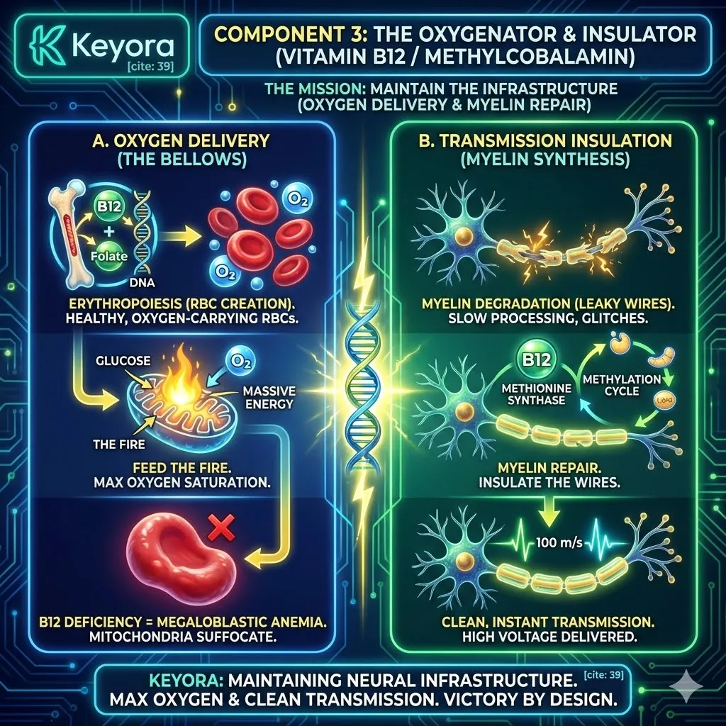 * **Transmission:** **Vitamin B12** drives myelin synthesis to insulate the neural transmission of this energy.