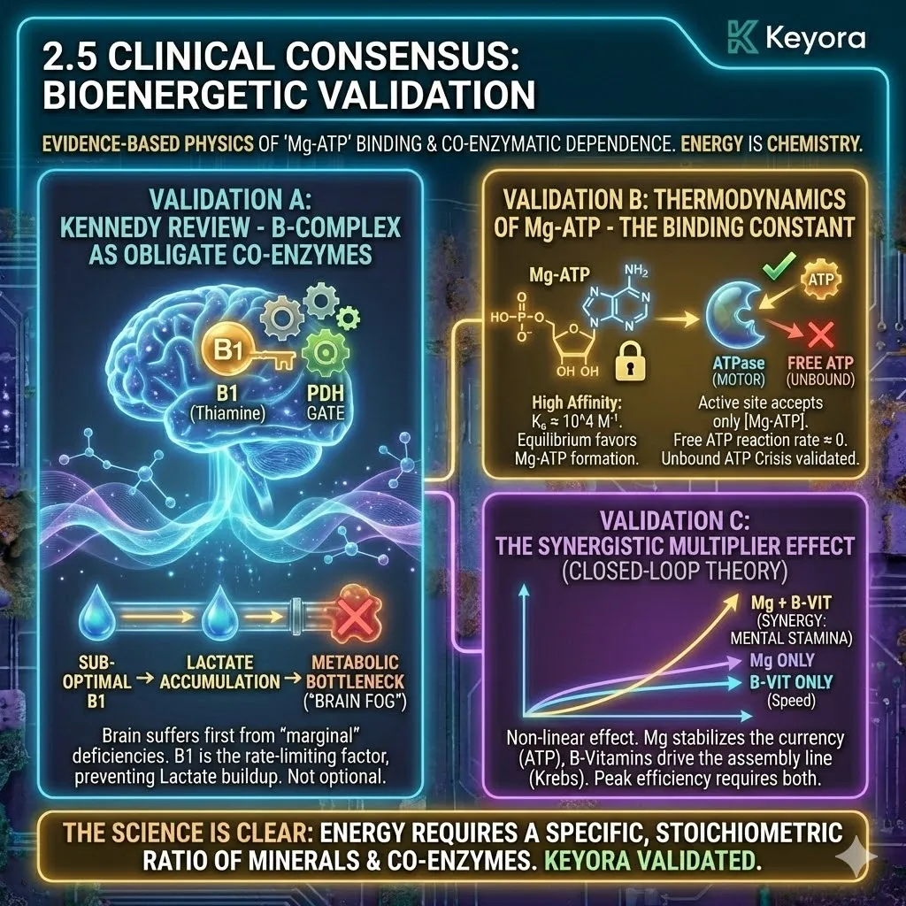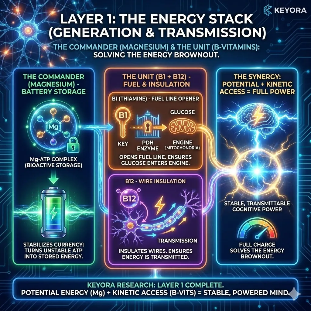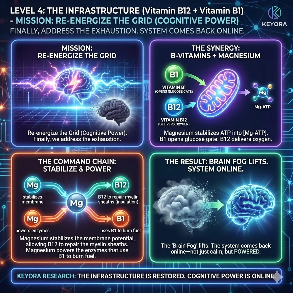 Vitamin B1 (Thiamine) attempts to fuel the mitochondria, but it cannot become the active coenzyme (TPP) without Magnesium.