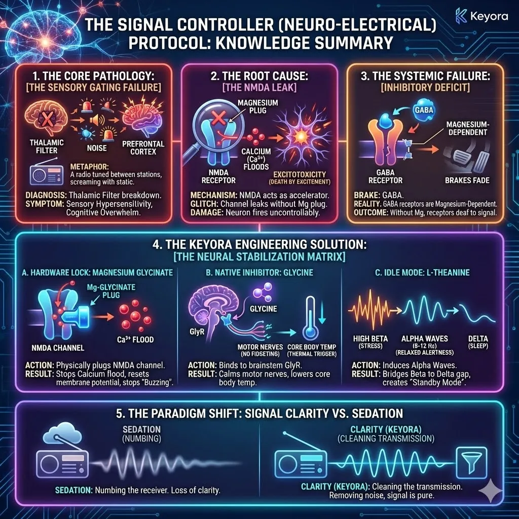 * **Software Command:** **L-Theanine** acts as a glutamatergic analogue to induce **Alpha Waves** (8-12 Hz), bridging the gap between Beta (Stress) and Delta (Sleep).